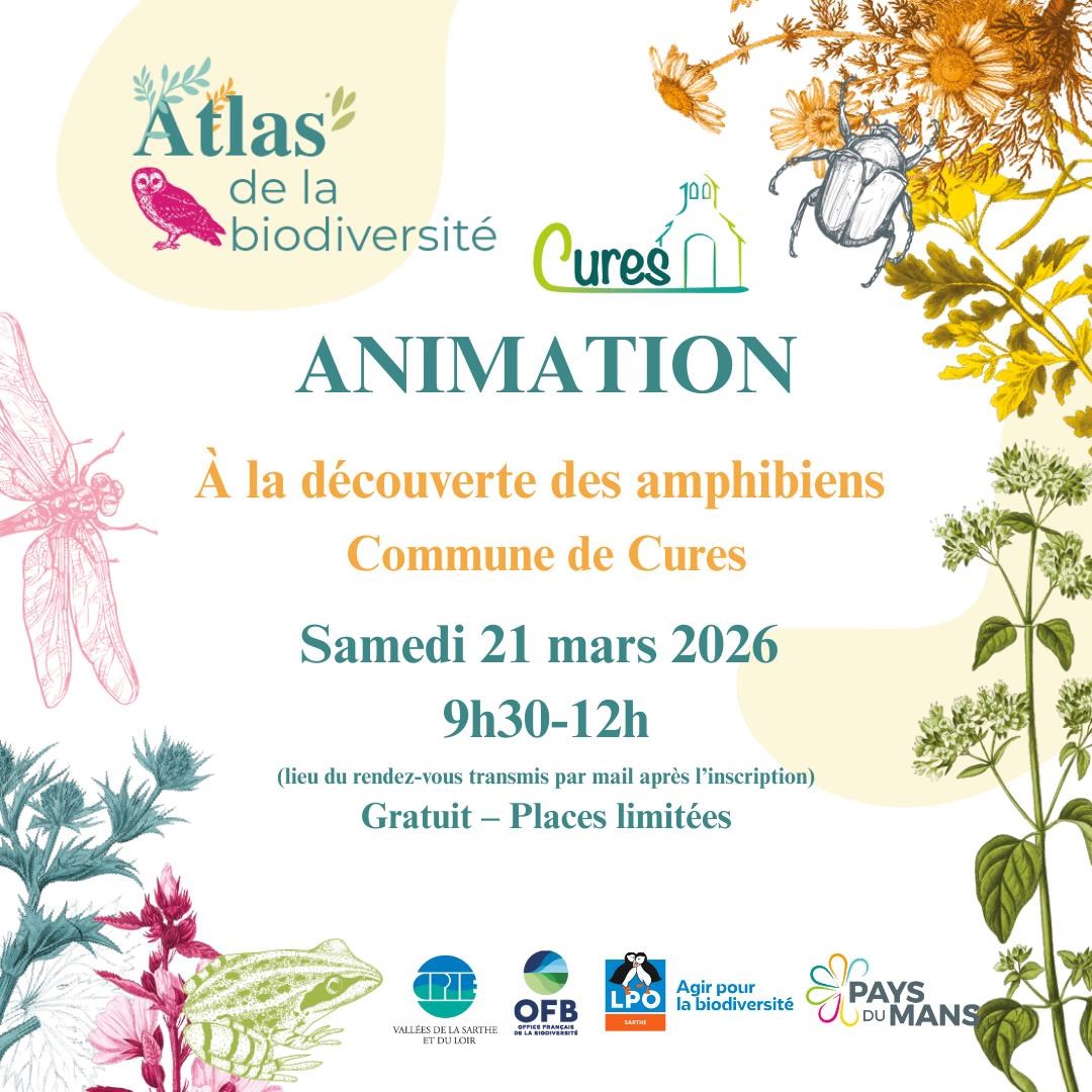 Accompagné par un écologue de la LPO Sarthe, partez à la découverte des amphibiens sur la commune de Cures ! Cette matinée comprendra une partie théorique en salle, suivie d’une sortie sur le terrain autour d’une mare à proximité.