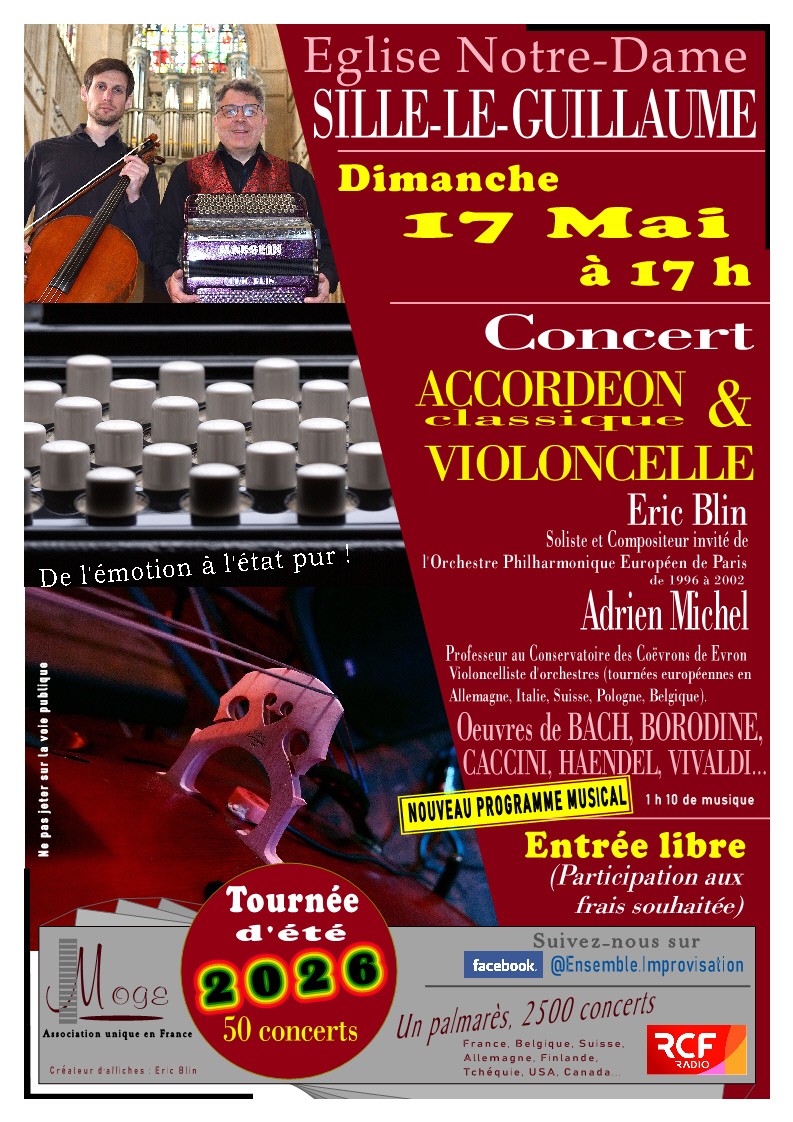En accord avec la paroisse de Sillé-le-Guillaume, l’association « MUSIQUES ORIGINALES DE LA GRANDE EUROPE » présente un concert de musique classique. Entrée libre (avec une participation aux frais souhaitée) de l’Ensemble Improvisation – en duo :