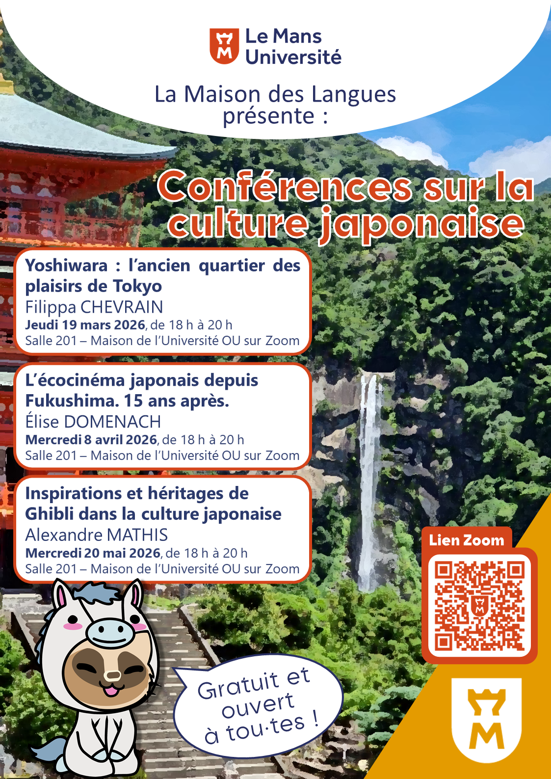 La Maison des Langues de Le Mans Université propose une série de séminaires consacrés à la langue et à la culture japonaise. Ces rendez-vous invitent à découvrir différents aspects de l’histoire, de la société et de l’imaginaire japonais, à travers le regard de spécialistes.