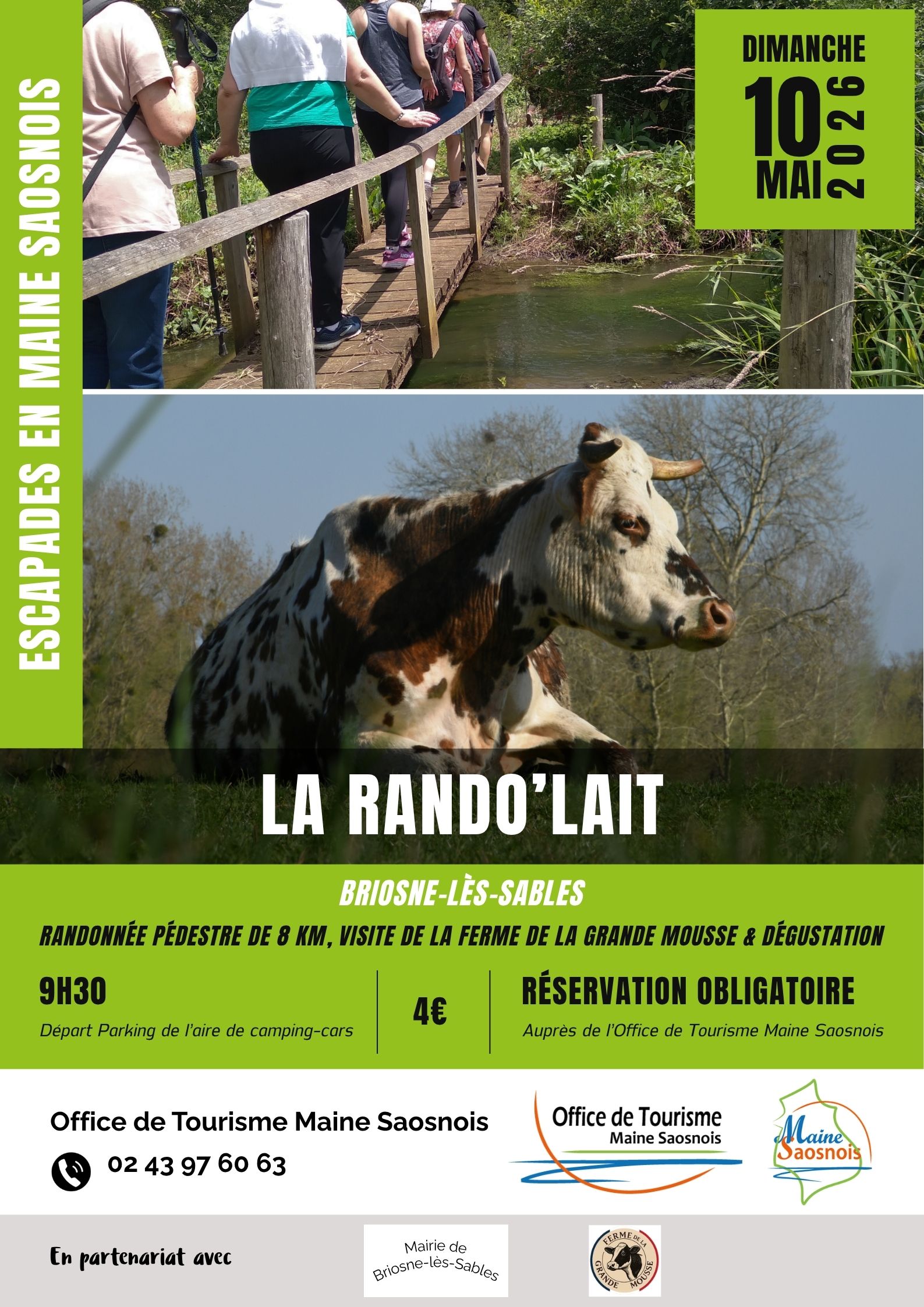Dans le cadre de ses Escapades en Maine Saosnois, l’Office de Tourisme Maine Saosnois vous propose une randonnée pédestre de 8km autour de Briosne-lès-Sables, suivie d’une visite de la Ferme de la Grande Mousse.