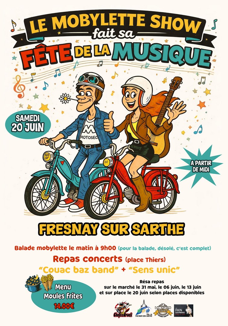 À la suite de la traditionnelle balade du Mobylette Show (édition 2026 complète), l’équipe de Chapitorock vous donne rendez-vous pour un après-midi festif pour la Fête la Musique à partir de midi Place Thiers à Fresnay-sur-Sarthe ! Au programme : repas moules-frites (14€ par personne, sur réservation) et concerts de Couac Baz Band et Sens Unic.
