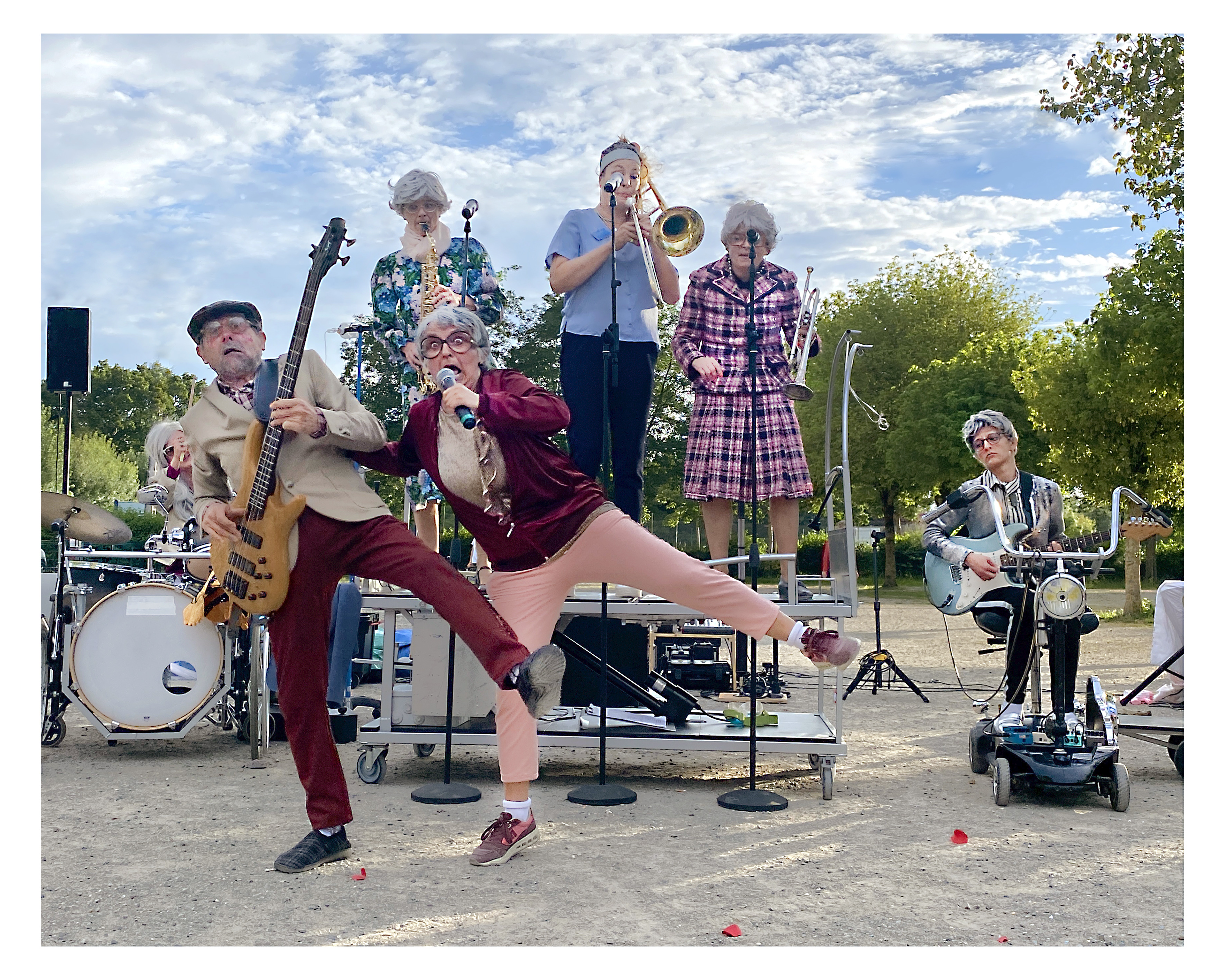 Les résidents de l’Ehpad des Mots Bleus font voler en éclat les murs de l’institution. Branchés de toutes parts, ils investissent la rue en musique, avec la joyeuse détermination de remettre les vieilles et les vieux sur la place publique.