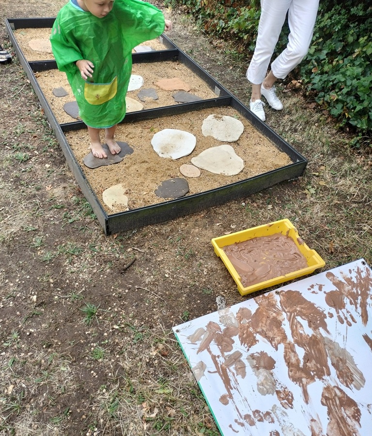 Les pieds dans l’argile puis les mains dans le sable, les tout-petits expérimentent les matières.