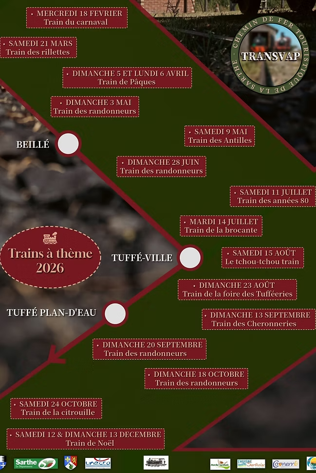 Rendez-vous dépôt de Beillé (derrière la gare SNCF, accès route de La Chapelle Saint-Rémy), renseignements et réservation : Perche Sarthois 02.43.60.72.77 ou Transvap 02.43.89.00.37